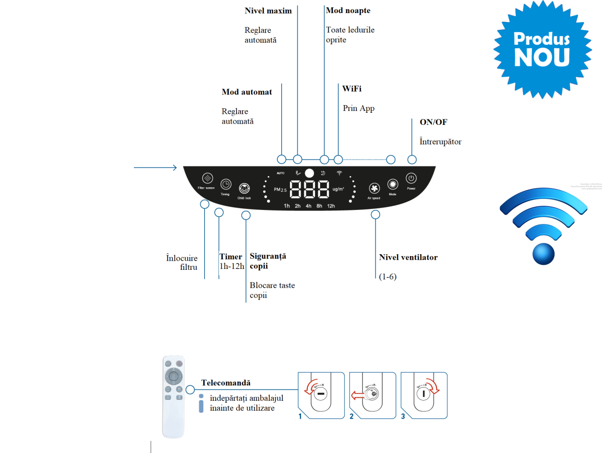 - Timer, Blocare taste copii, indicator schimbare filtru cu leduri in lumini diferite care indica calitatea aerului