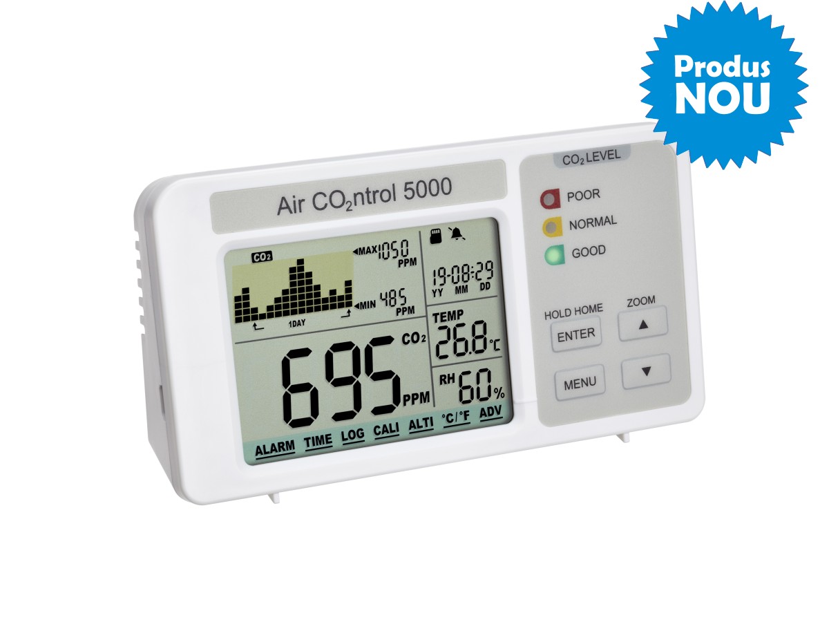 AirCO2ntrol 5000 este un monitor CO2 cu funcție de înregistrare a datelor prin card SD. Pe lângă nivelurile de CO2, dispozitivul măsoară temperatura și umiditatea mediului și vă informează despre dată și oră.